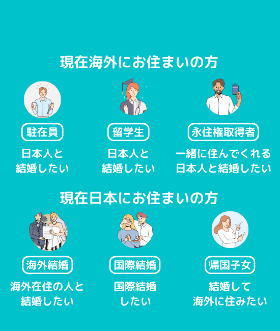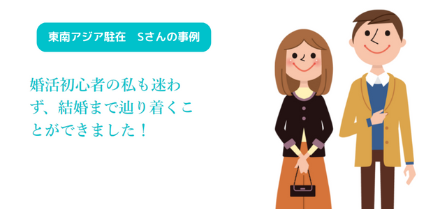 最近の海外婚活事例では、米国駐在員の31歳の男性が日本在住の25歳の女性と、お見合いから入籍まで5ヵ月のスピード婚を実現した例など、海外駐在員、海外在住者の婚約実績が多数あるので安心して活動できます。