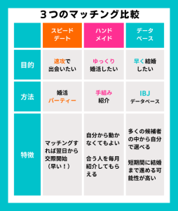 3つのマッチング方法があります。手軽にお相手を見つけたいならスピードデート・マッチング。婚活パーティーでお相手を探します。ピュア・グローバル・マッチングでは毎月、婚活パーティーを開催しています。ゆっくり婚活したい方には、ハンドメイド・マッチングがおすすめ。あなたにピッタリなお相手を毎月2名紹介いたします。早く結婚したいと思っている人は、IBJを使ったデータベース・マッチング。1年以内の結婚も夢ではありません。