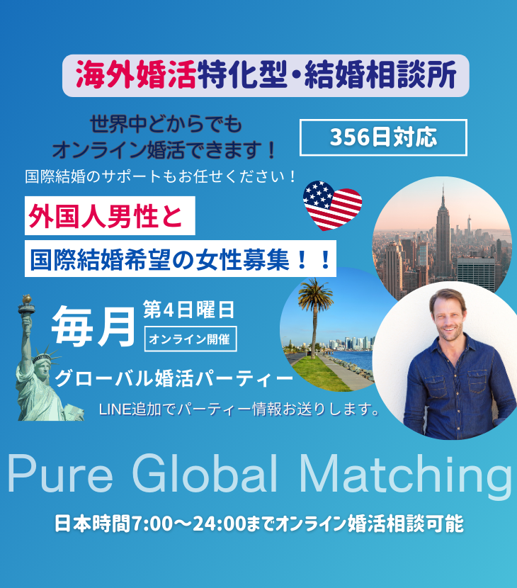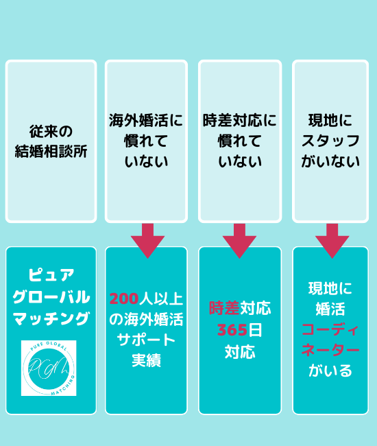 タイ、中東、ドイツ、フランス、シンガポール、マレーシア、米国在住のピュア・グローバル・マッチング専属婚活コーディネーターが、現地で直接あなたをサポートします。またアメリカの東海岸と西海岸に拠点がある国際結婚相談所(マッチメイカー)を通してハンドメイド・マッチング(手組み紹介)もできます。ピュア・グローバル・マッチングなら、ほぼ全世界を網羅した婚活のお世話が可能です。